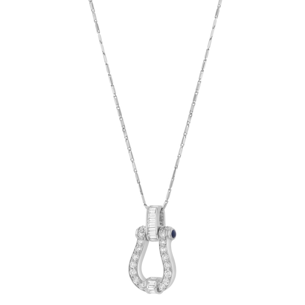 14K white gold horseshoe pendant set with 1.20 ct. baguette and round brilliant diamonds and adorned with two cabochon blue sapphires. Chain sold separately.