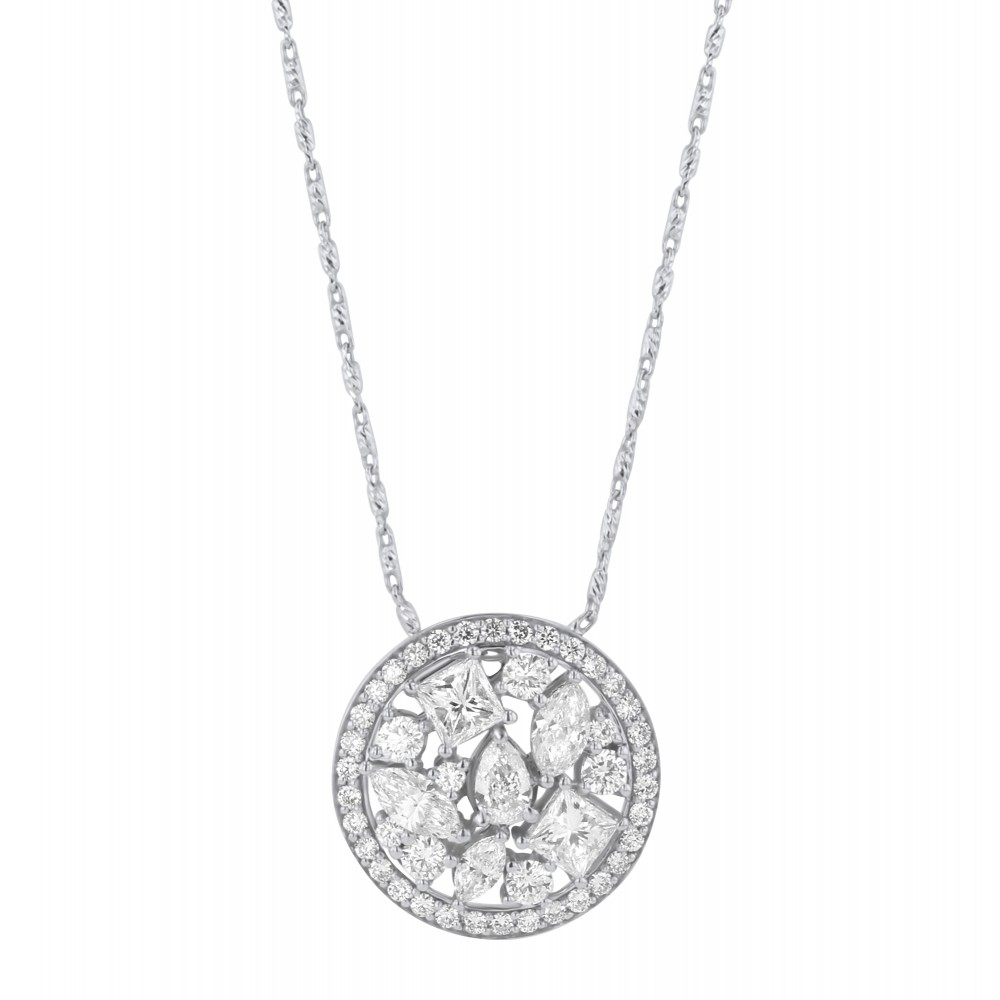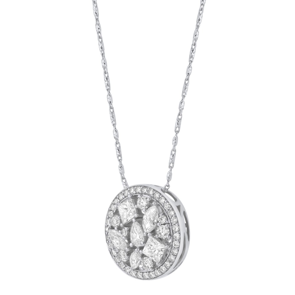 14K white gold round necklace set with 1.65 ct. princess, marquise and round diamonds. Chain sold separately.