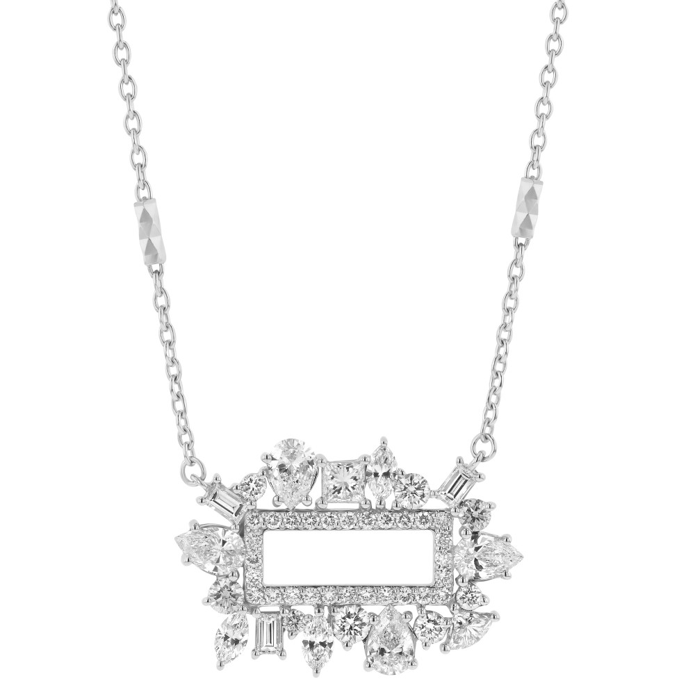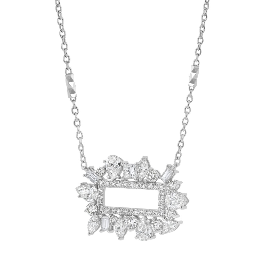 14K white gold rectangle shape picture frame necklace set with 1.75 ct. princess, baguette, marquise, pear and round diamonds. Chain included.