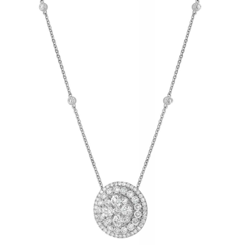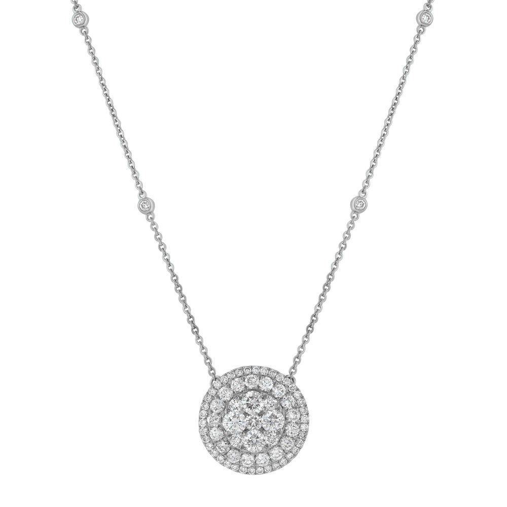 14K white gold layered halo round necklace set with 1.80 carat round brilliant diamonds and bezel set diamonds chain. Price includes chain.