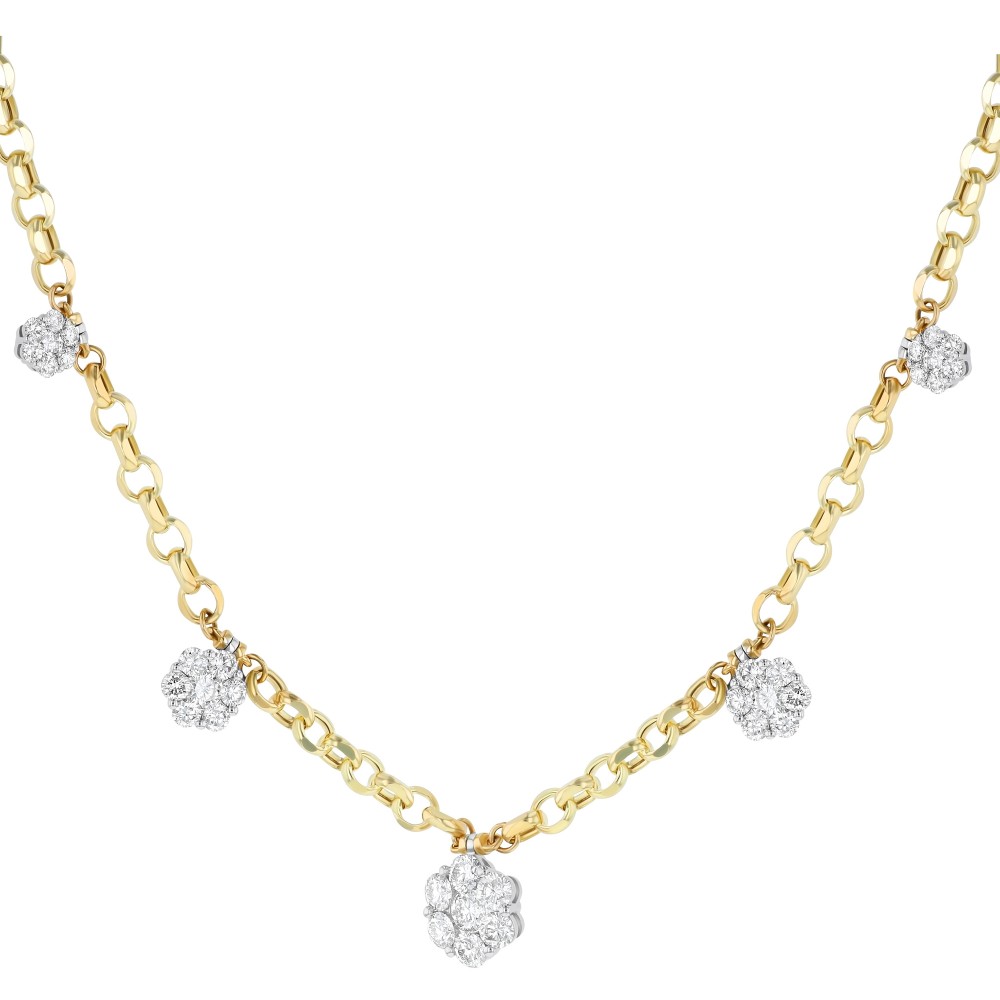 14K yellow and white gold prong set cluster flower stations necklace set with 2.45 ct. round brilliant diamonds.