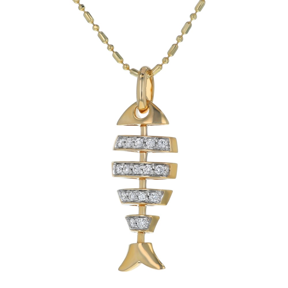 14K yellow gold dangling skeleton fish pendant set with 0.15 carat round brilliant diamonds. Chain sold separately.