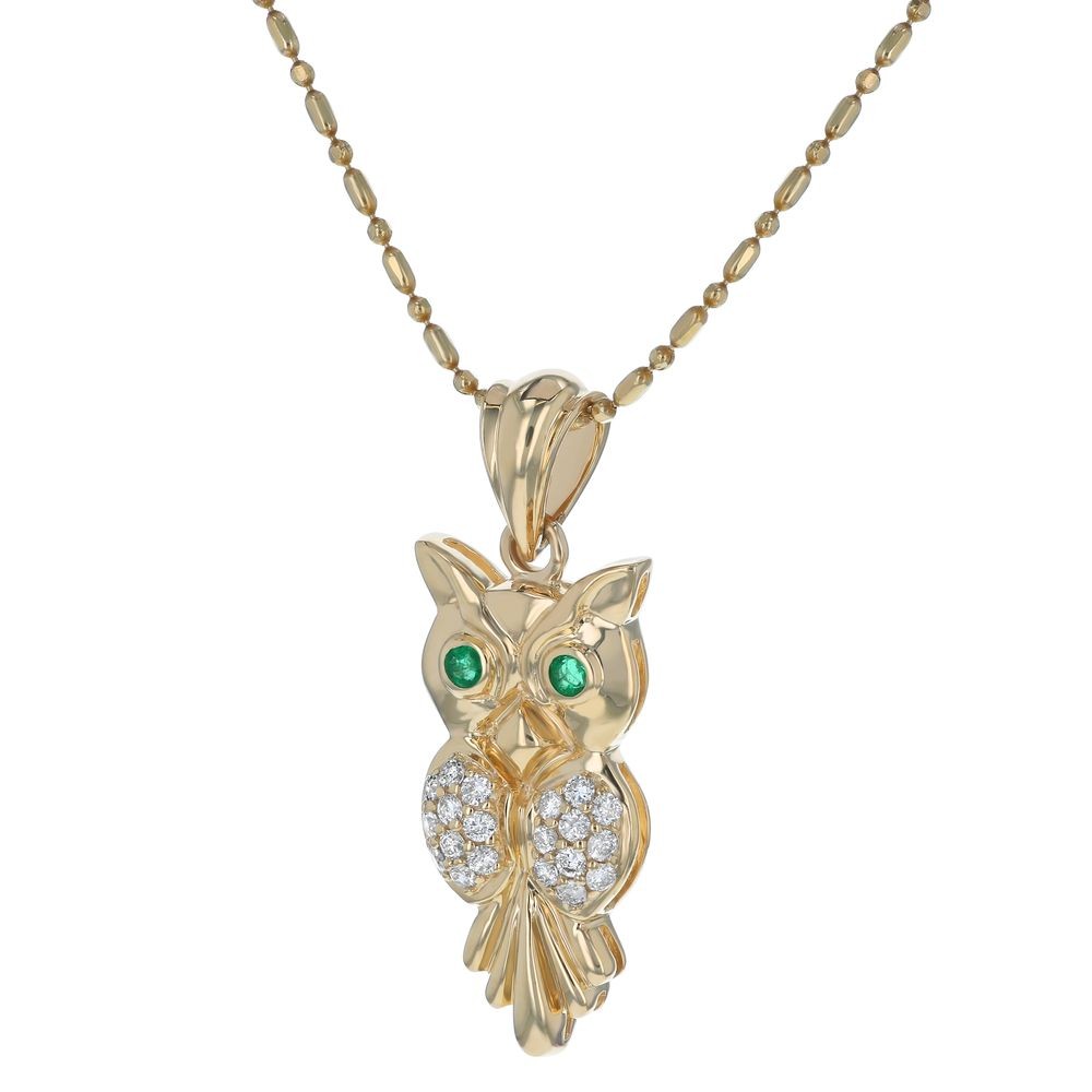 14K yellow gold owl pendant set with 0.16 carat round brilliant diamonds and 0.04 ct. green emerald eyes. The pendant is detailed with high polish finish. Chain sold separately.