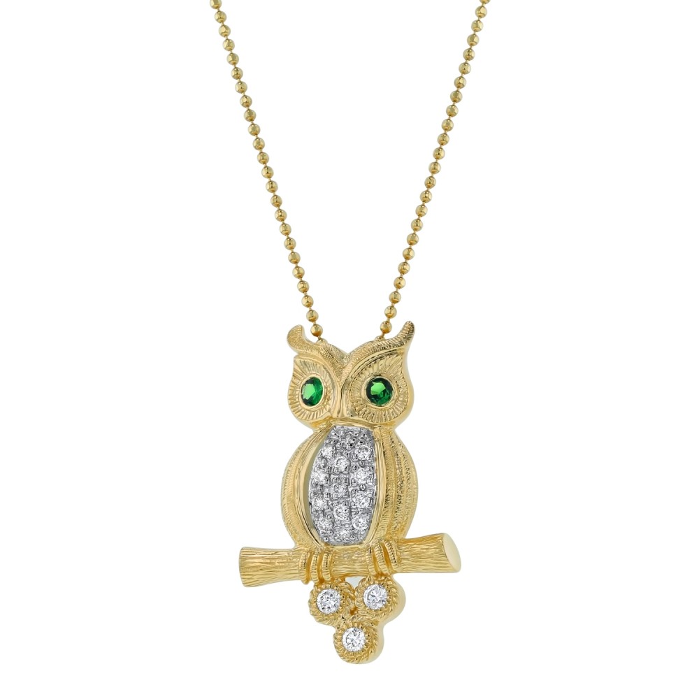 14K yellow gold owl pendant set with 0.25 carat round brilliant diamonds and 0.12 carat Tsavorite eyes. Chain sold separately.
