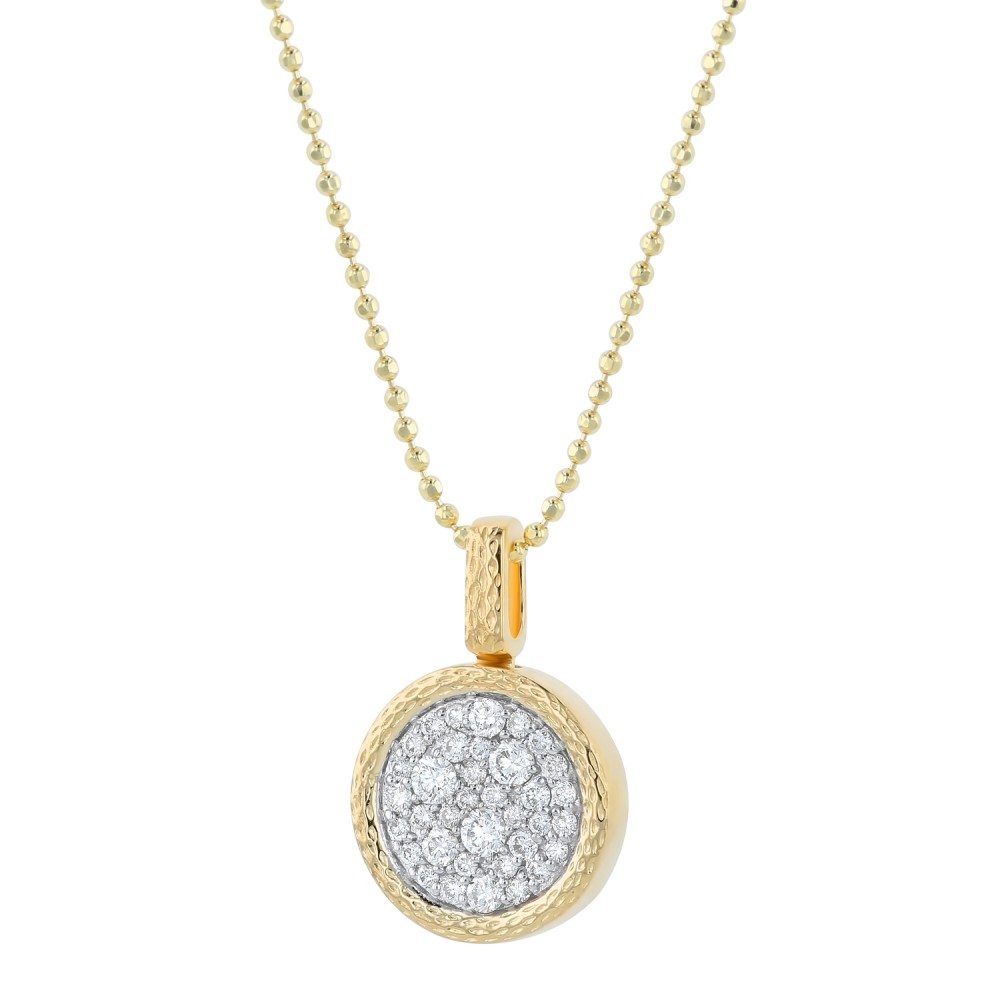14K yellow gold round pendant pave set with 0.30 carat round brilliant diamonds in hammered textured finish. Chain sold separately.