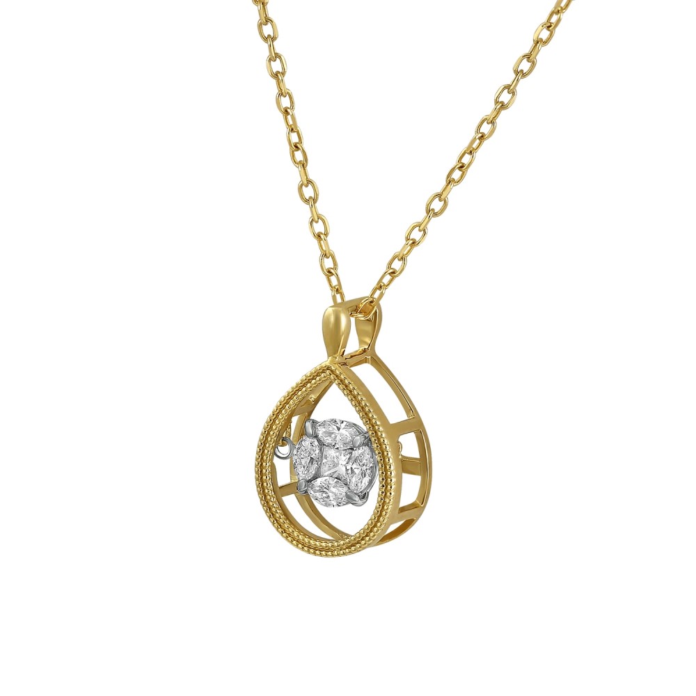 14K yellow gold pear shape necklace set with 0.31 carat Dancing center featuring marquise and princess fusion set diamonds. Chain sold separately.