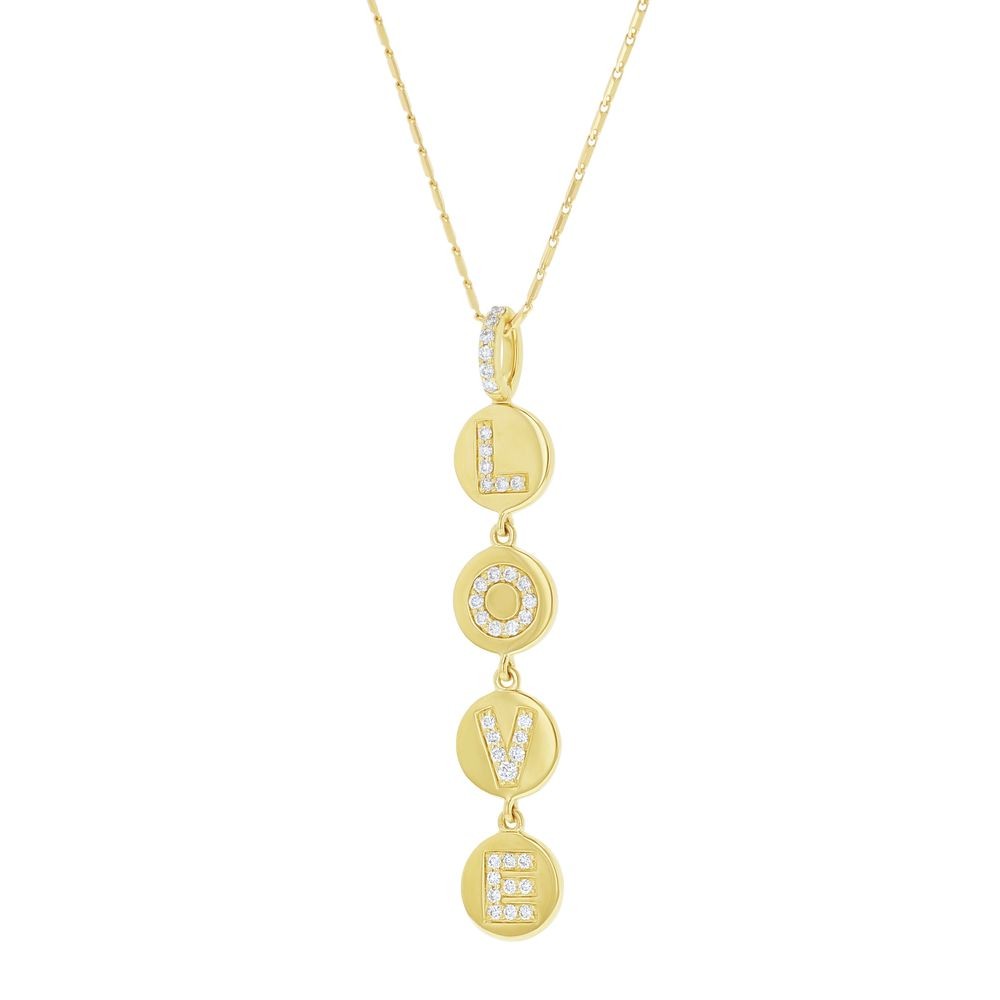 14K yellow gold LOVE dangling necklace set with 0.32 carat round brilliant diamonds and detailed with high polish. Chain sold separately.