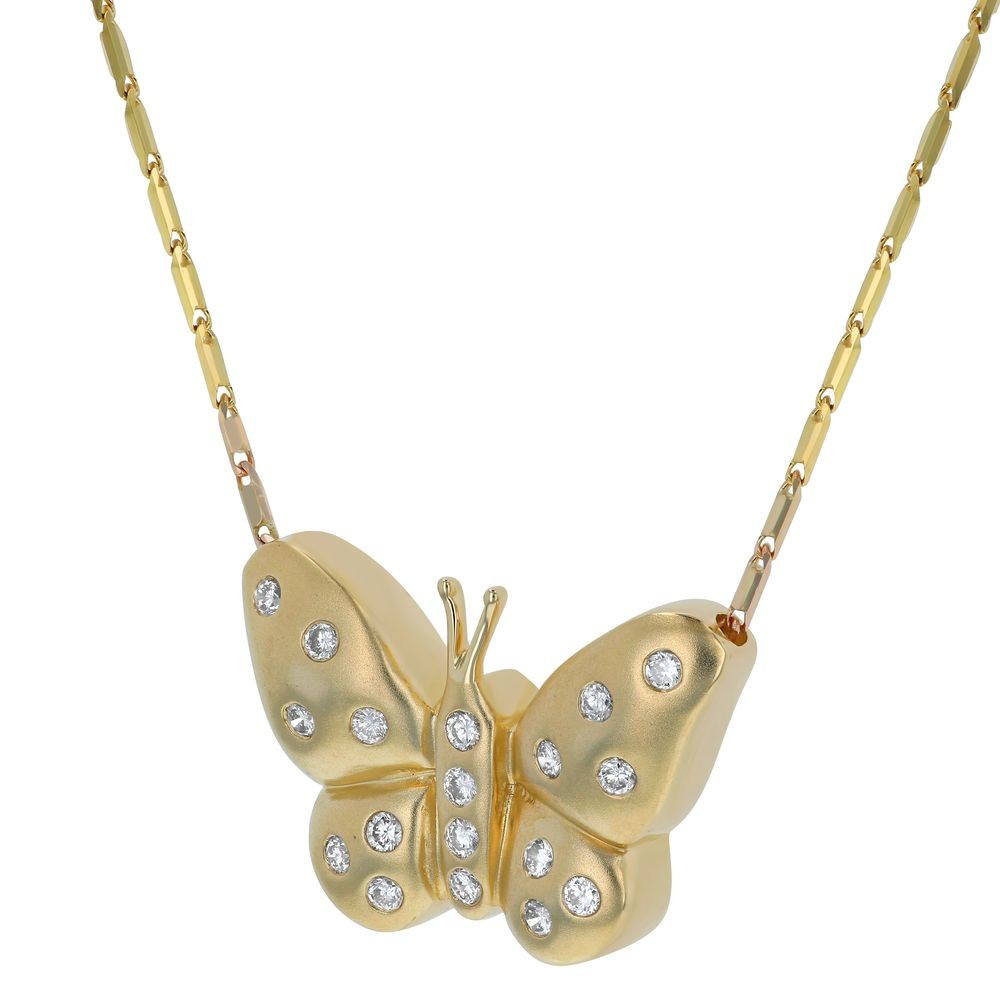 14K yellow gold butterfly necklace set with 0.35 carat round brilliant diamonds and detailed with satin finish. Chain included.