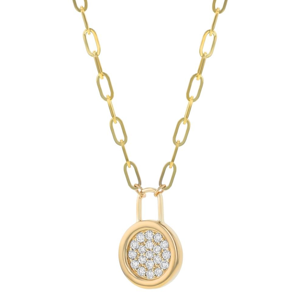 14K yellow gold necklace set with 0.35 carat round brilliant diamonds with pave circle circles design on paperclip chain. Chain included.