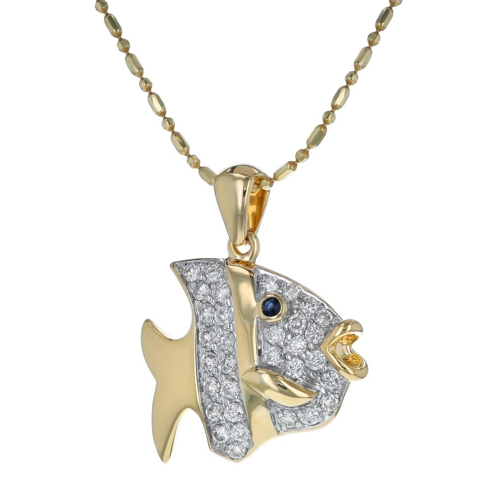 14K yellow gold fish pendant set with 0.35 carat round brilliant diamonds and 0.02 ct. blue sapphire eye. The pendant is detailed with satin finish. Chain sold separately.