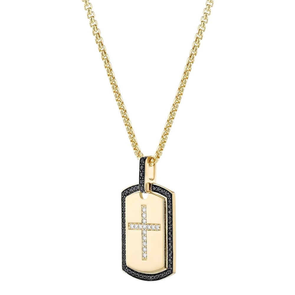 14K yellow gold dog tag shape pendant set with 0.10 carat white diamonds and 0.30 carat black diamonds in cross design and detailed with black rhodium. Chain sold separately.