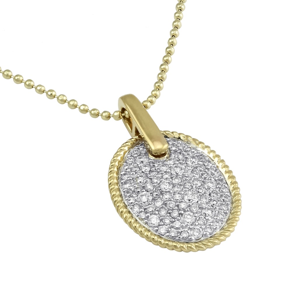 14K yellow gold oval pendant pave set with 0.40 carat round brilliant diamonds in braid finish. Chain sold separately.