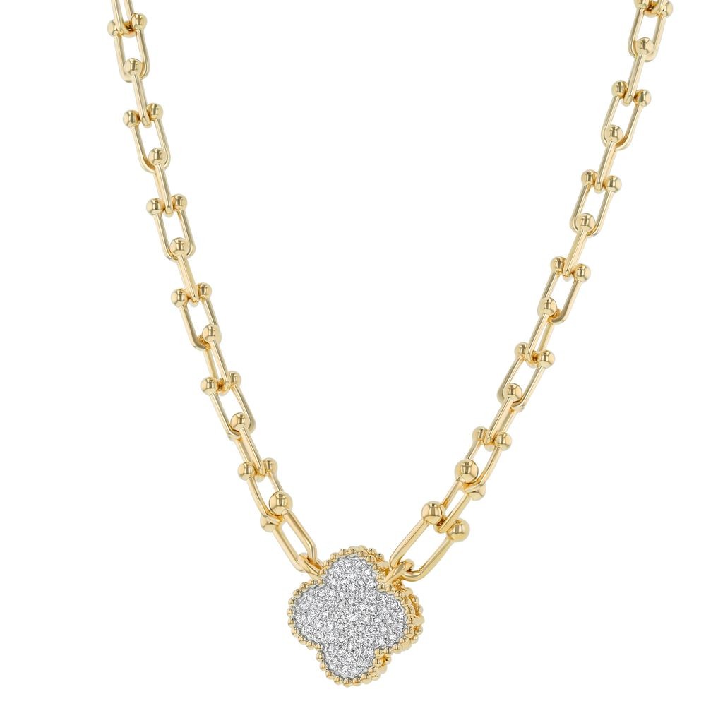14K yellow gold clover necklace set with 0.45 carat round brilliant diamonds on heavy hardware chain (25 grams). Price includes chain.