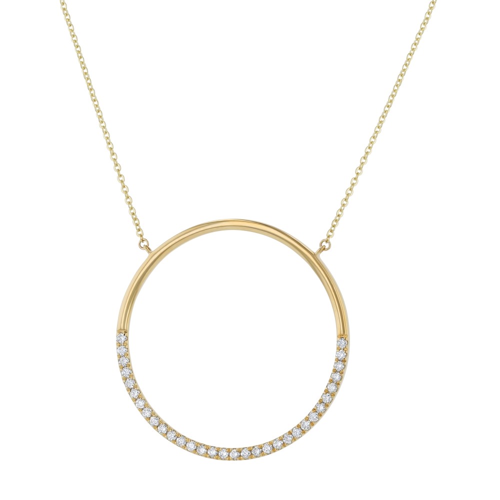 14K yellow gold large circle shape necklace set with 0.45 carat round brilliant diamonds on cable chain. Price includes chain.