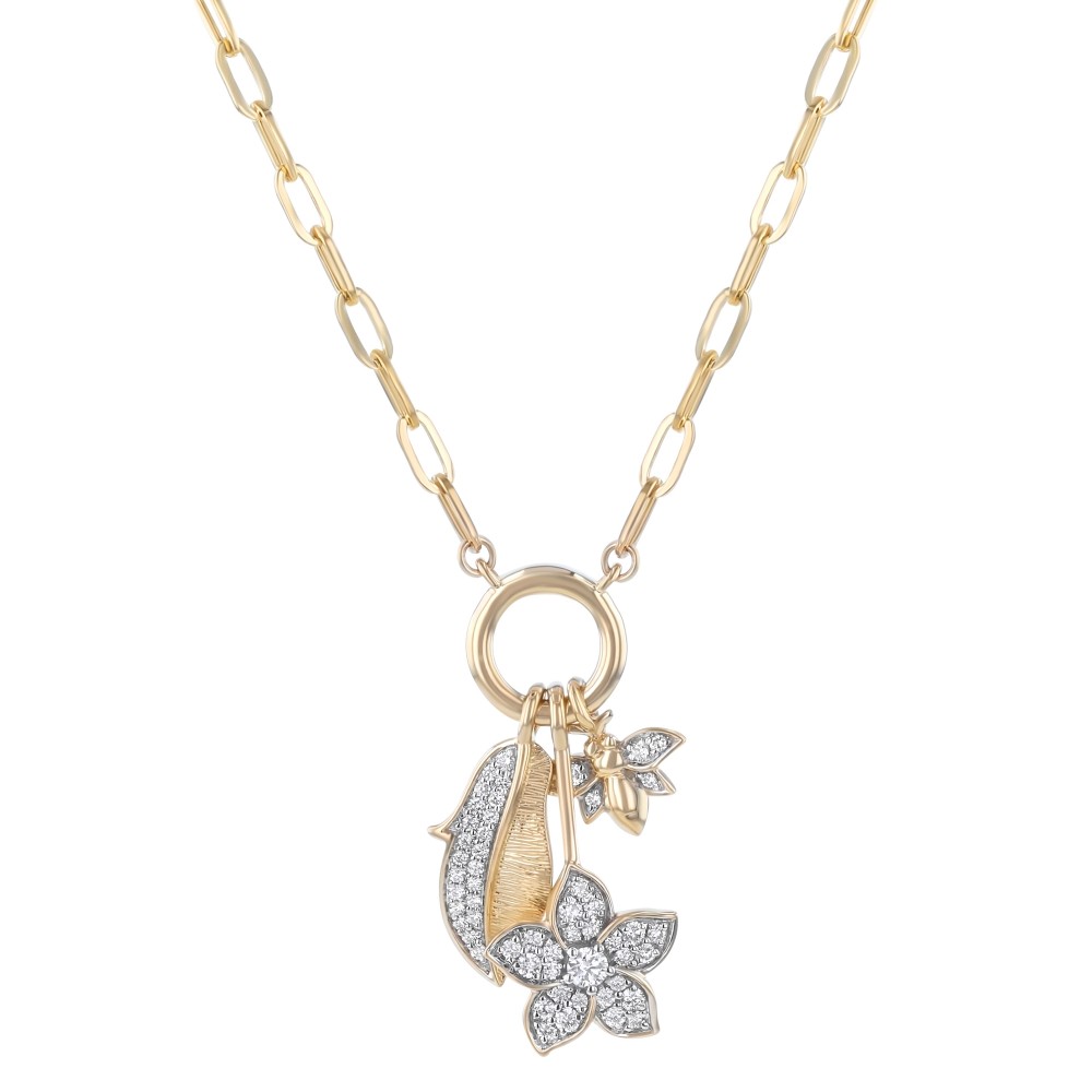 14K yellow gold butterfly, flower and leaf charm necklace set with 0.45 carat round brilliant diamonds. Price includes chain.