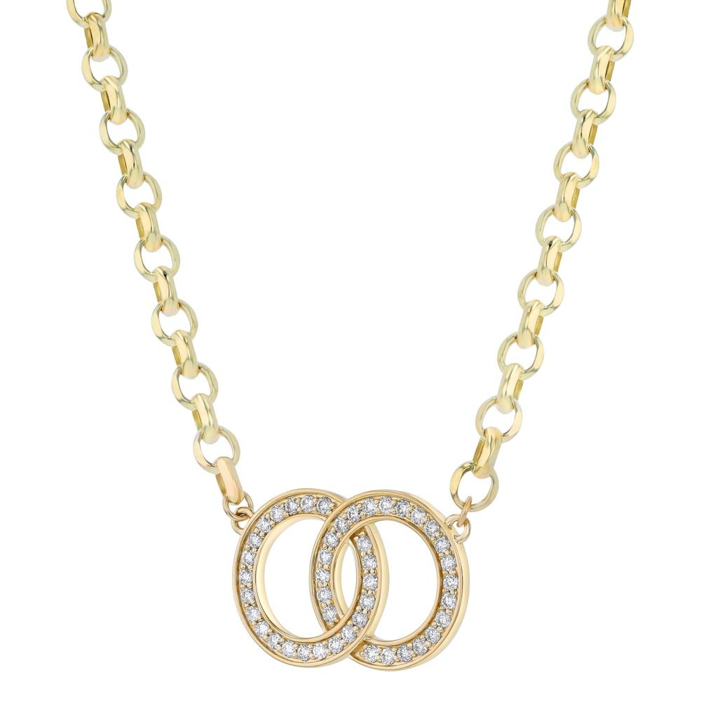 14K yellow gold necklace set with 0.50 carat round brilliant diamonds with interlocked circles design on Rollo chain. Cahin included.