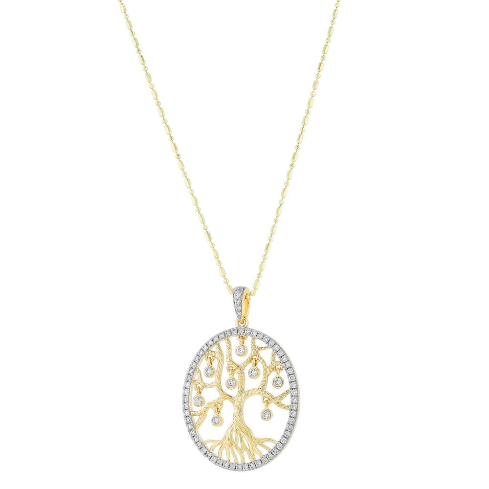14K yellow gold oval framed TREE OF LIFE necklace set with 0.50 carat round brilliant diamonds. The suspended diamond bezels move and dangle freely, generating vibrant sparkle. Chain sold separately.