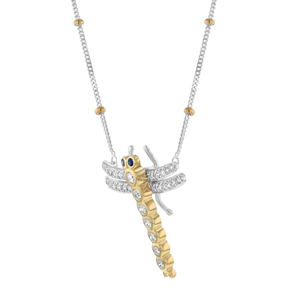 14K yellow gold dragonfly pendant set with 0.47 carat round brilliant diamonds and 0.04 ct. blue sapphires eyes. Chain included.