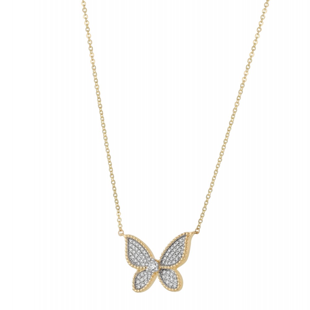 14K yellow gold butterfly necklace set with 0.50 carat round brilliant diamonds and milgrain finish. Price includes chain.