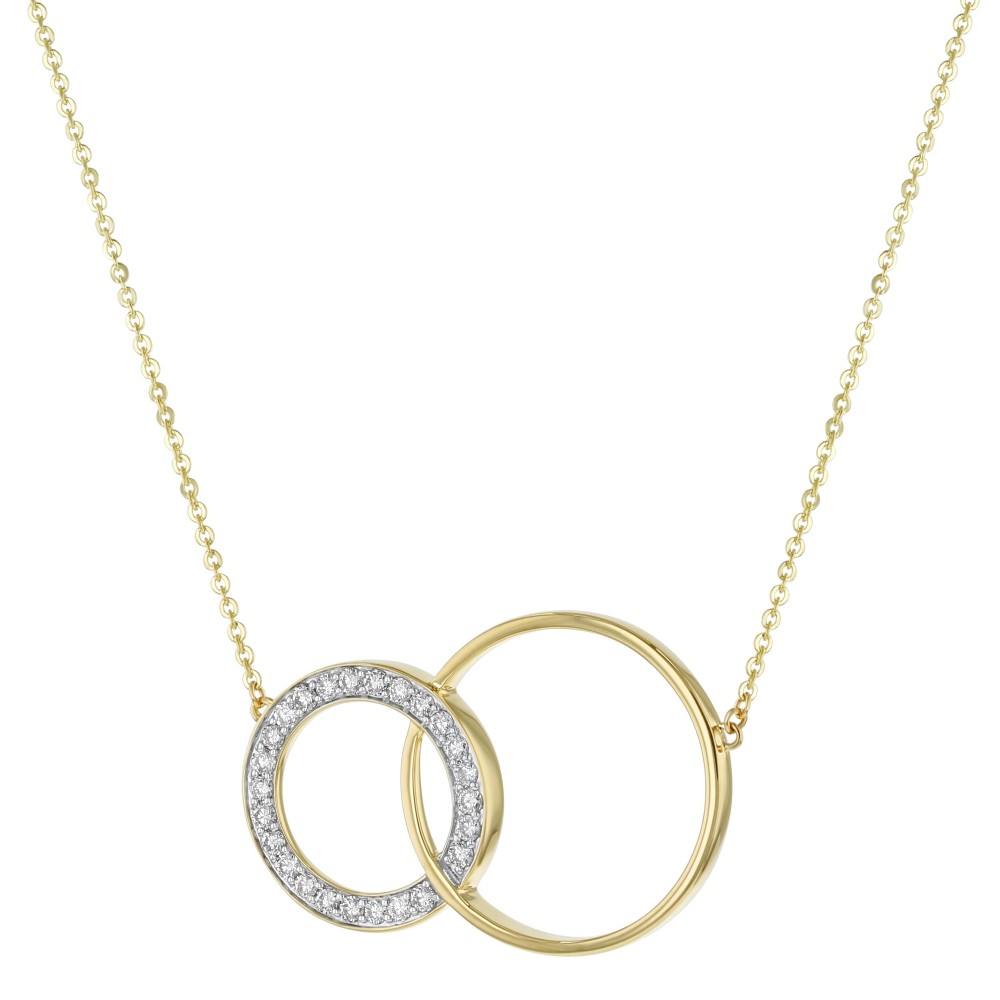 14K yellow gold entwined circles necklace set with 0.50 carat round brilliant diamonds on cable chain. Price includes chain.
