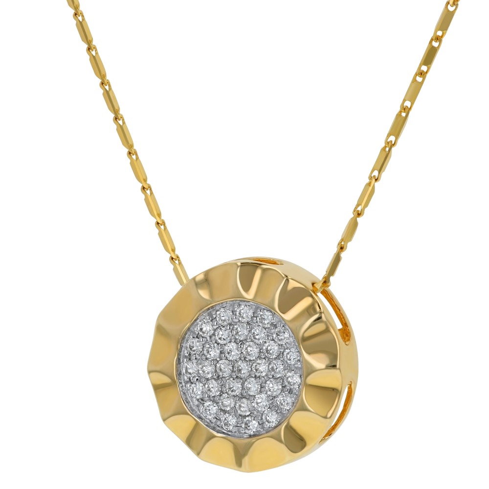 14K yellow gold round pendant pave set with 0.50 carat round brilliant diamonds in hammered polish finish. Chain sold separately.