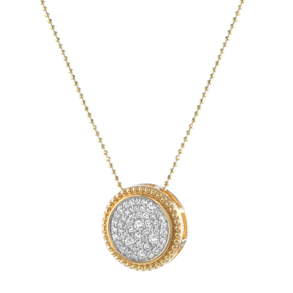 14K yellow gold round pendant pave set with 0.50 carat round brilliant diamonds in milgraing detailing and polished finish. Chain sold separately.