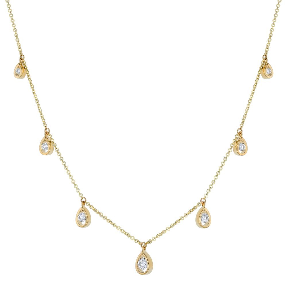 14K yellow gold necklace set with 0.50 carat round brilliant diamonds in stations tear drop design on cable chain. Chain included.