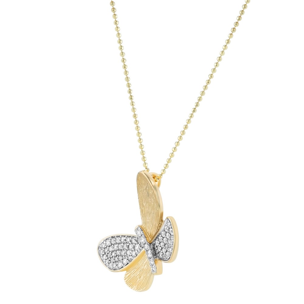 14K yellow gold butterfly necklace set with 0.50 carat round brilliant diamonds and textured finish. Chain sold separately.
