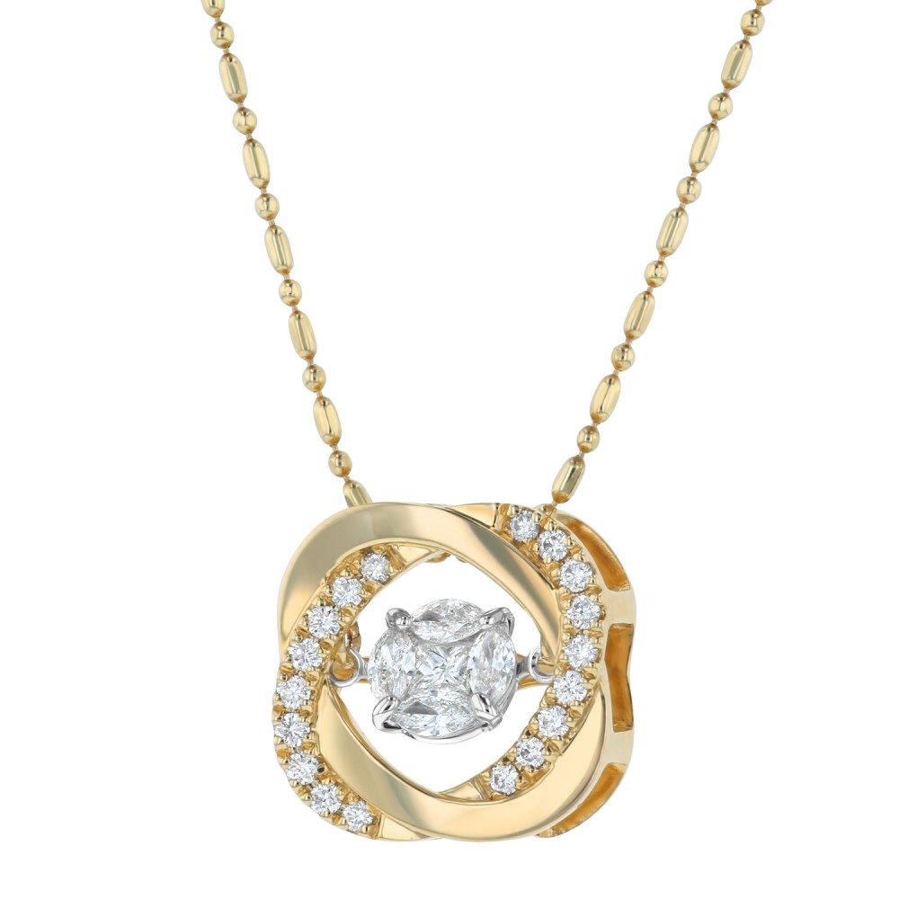 14K yellow gold flower shape necklace set with 0.50 carat Diamonds. The Dancing center features 0.32 carat marquise and princess fusion set diamonds and the halo is set with 0.19 carat round diamonds. Chain sold separately.