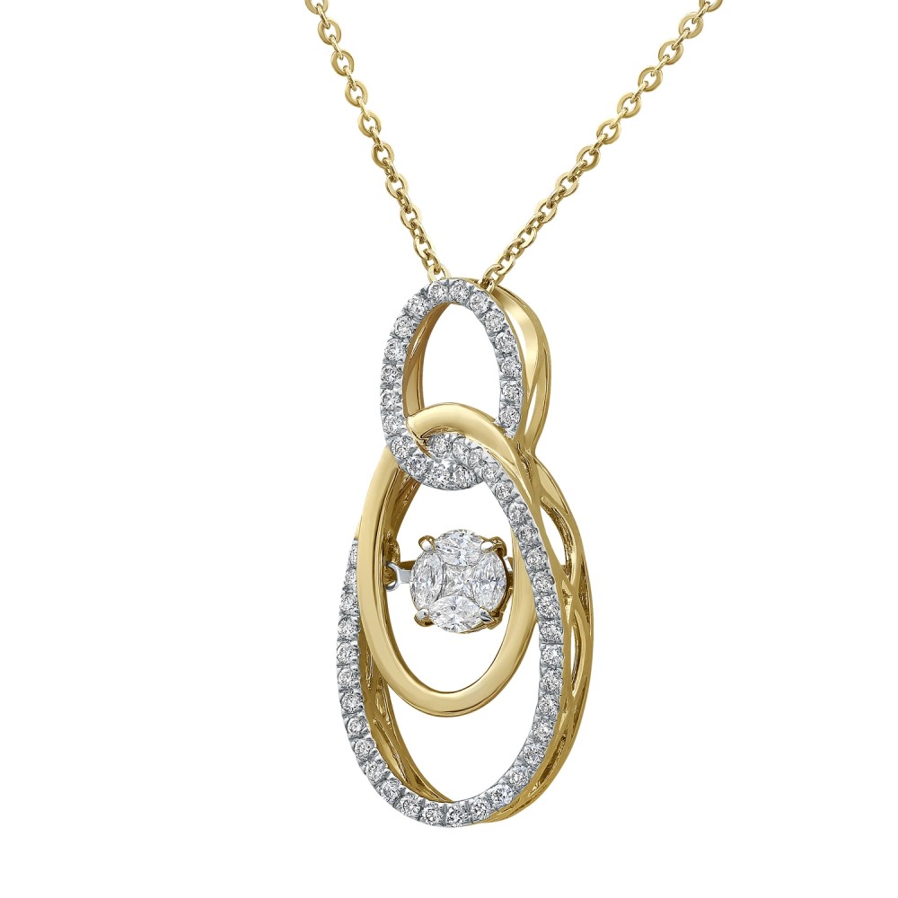 14K yellow gold entwined oval shapes necklace set with 0.50 carat Diamonds. The Dancing center features 0.20 carat marquise and princess fusion set diamonds and the halo is set with 0.30 carat round diamonds. Chain sold separately.