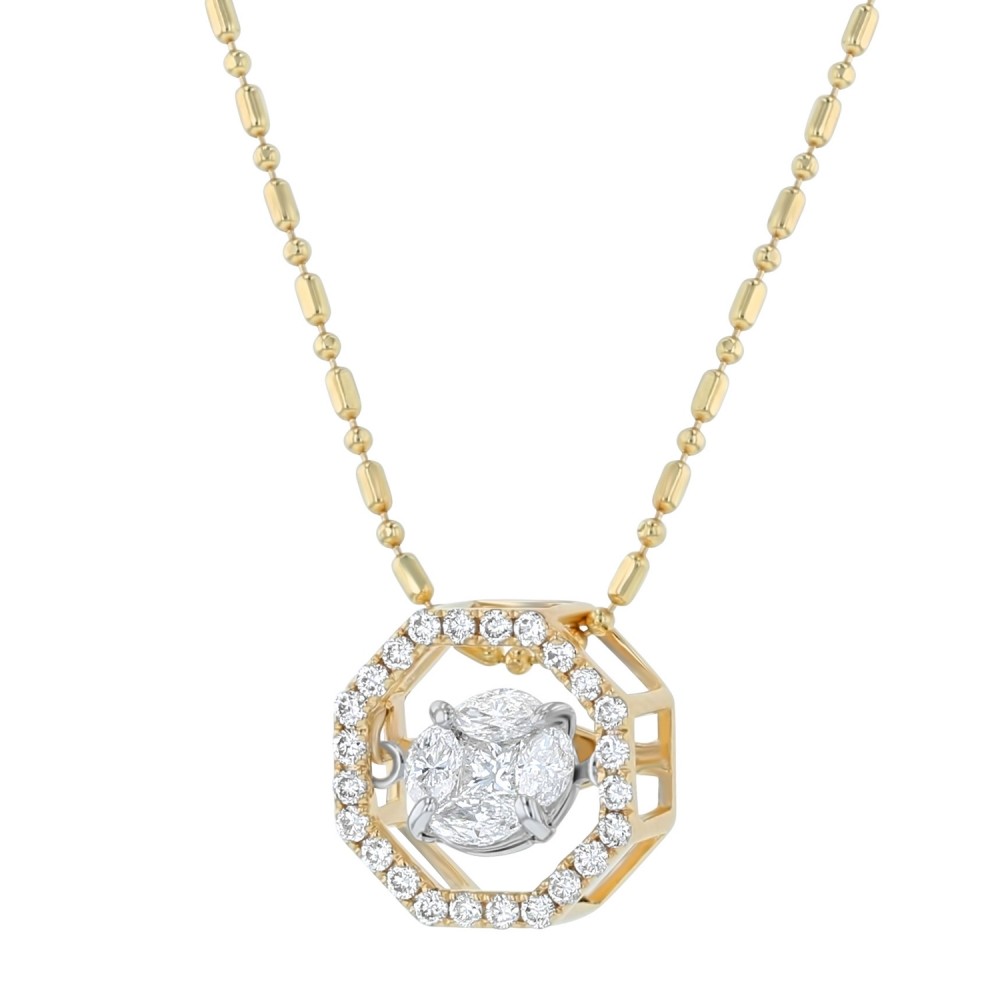 14K yellow gold octagon shape necklace set with 0.50 carat Diamonds. The Dancing center features 0.32 carat marquise and princess fusion set diamonds and the halo is set with 0.19 carat round diamonds. Chain sold separately.