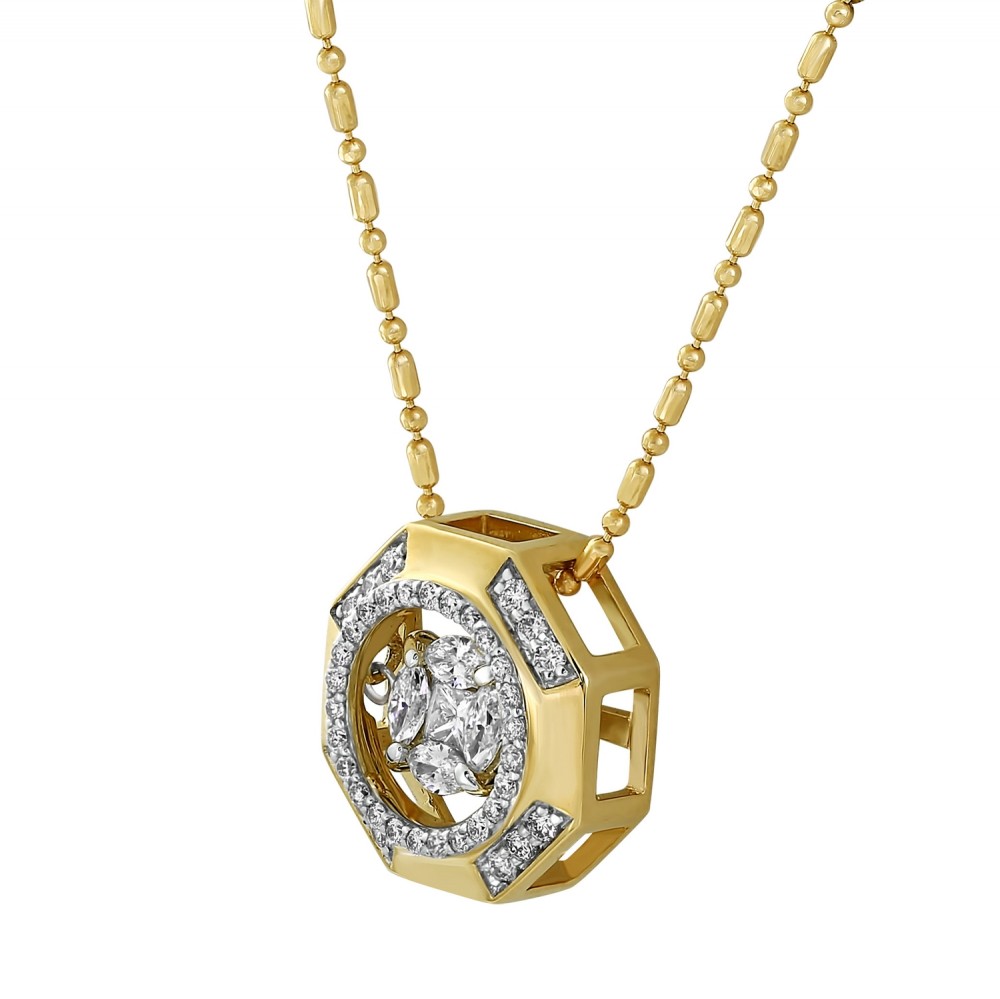 14K yellow gold octagon shape necklace set with 0.50 carat Diamonds. The Dancing center features 0.32 carat marquise and princess fusion set diamonds and the halo is set with 0.18 carat round diamonds. Chain sold separately.