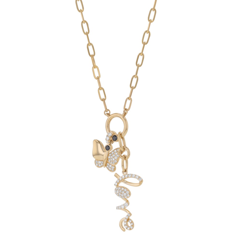 14K yellow gold butterfly and love charm necklace set with 0.55 carat round brilliant black and white diamonds. Chain included.