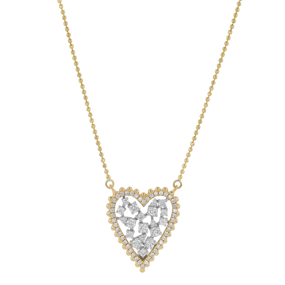 14K yellow gold heart shape necklace set with 0.55 carat round brilliant diamonds. Bead chain included.