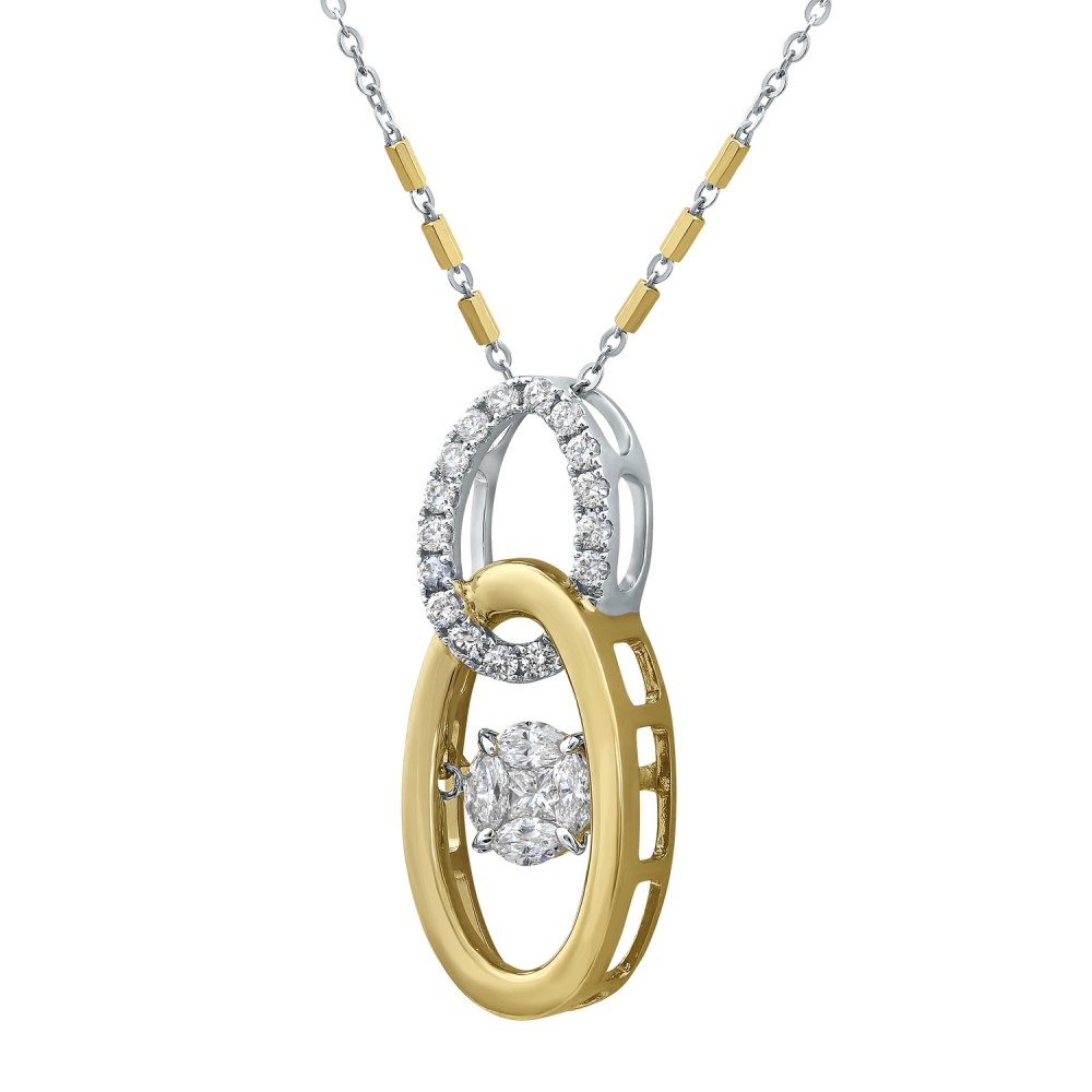 14K yellow gold entwined oval shapes necklace set with 0.55 carat Diamonds. The Dancing center features 0.32 carat marquise and princess fusion set diamonds and the halo is set with 0.24 carat round diamonds. Chain sold separately.