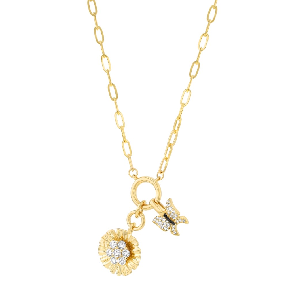 14K yellow gold butterfly and flower charm necklace set with 0.65 carat round brilliant black and white diamonds. Price includes chain.