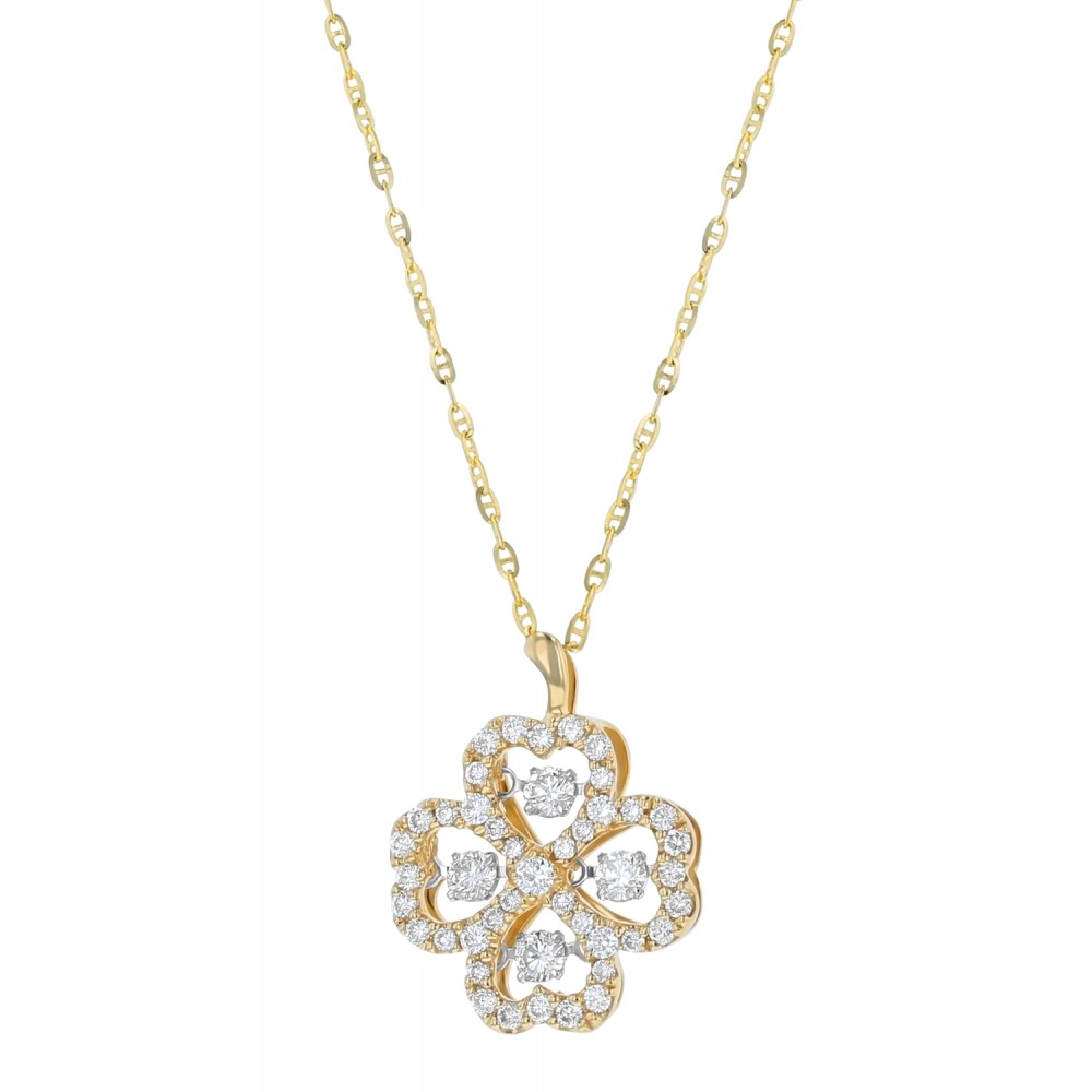 14K yellow gold clover shape necklace set with 4 x 0.07 carat Dancing diamonds and 0.38 carat halo diamonds. Chain sold separately.