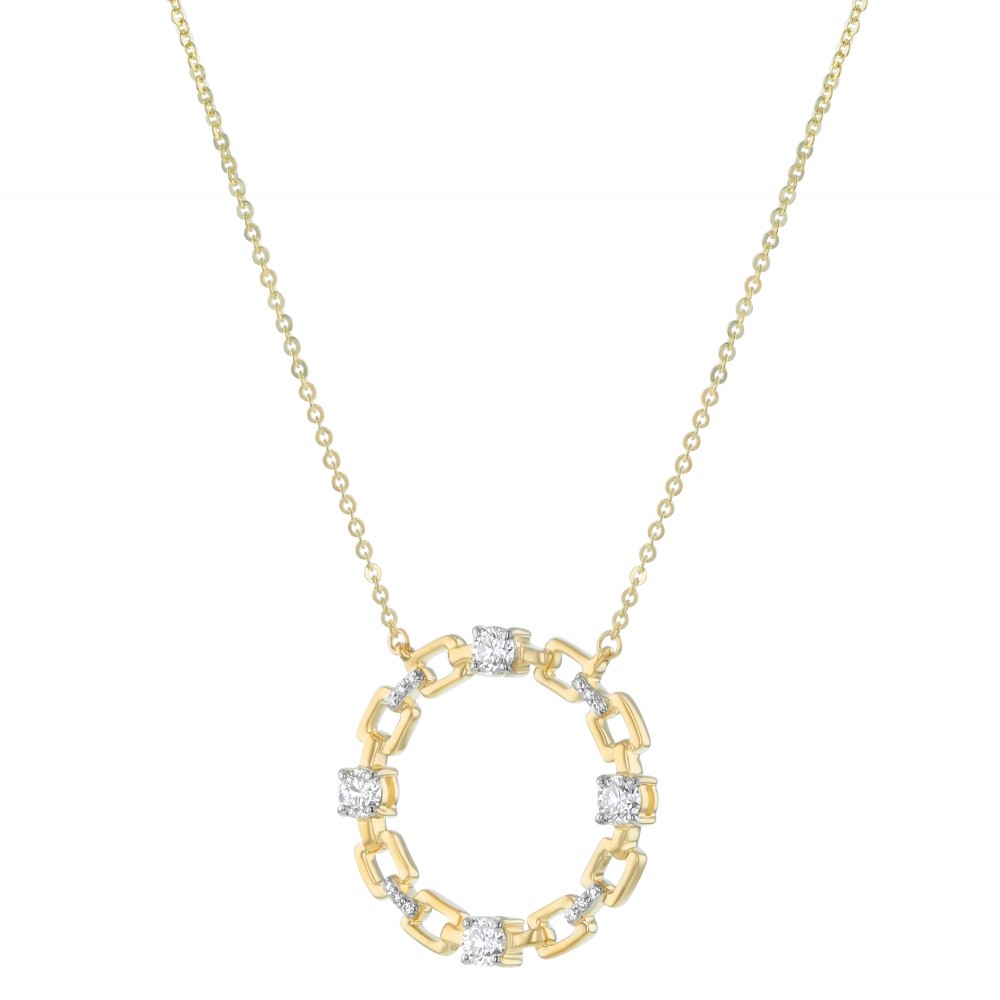 14K yellow gold circle shaped necklace set with 0.65 carat round diamonds. Chain included.