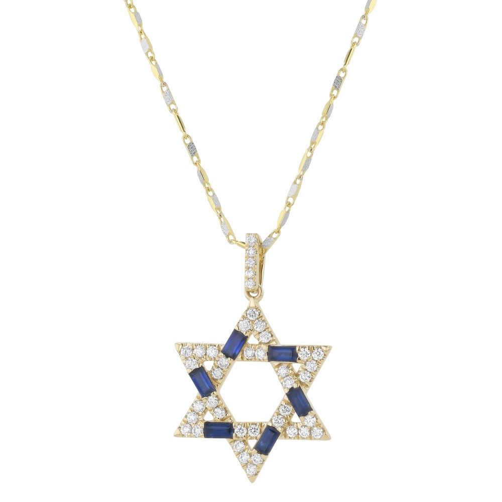 14K yellow gold star of David necklace set with 0.30 carat round brilliant white diamonds and 0.40 carat baguette blue sapphires. Chain sold separately.
