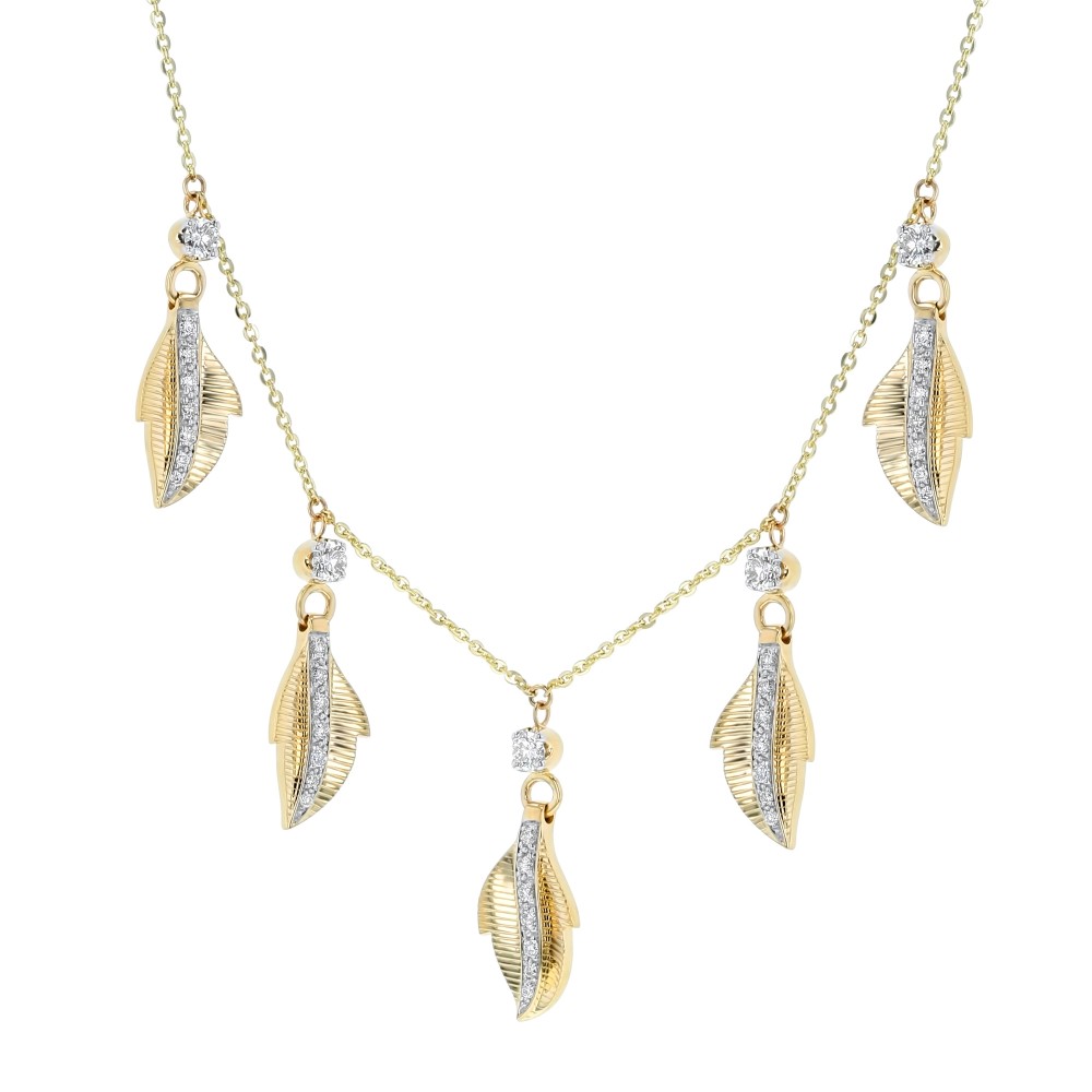14K yellow gold 5 textured leafs necklace set with 0.70 carat round brilliant diamonds. Price includes chain.