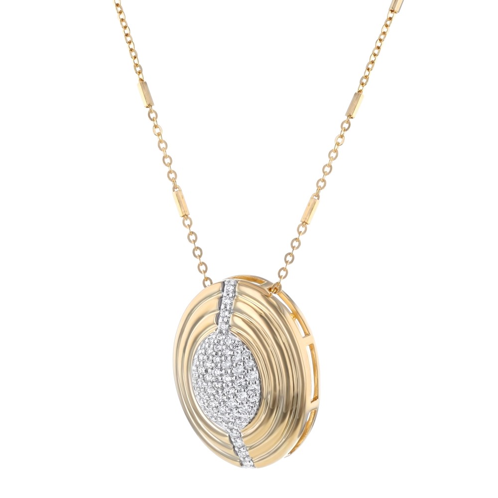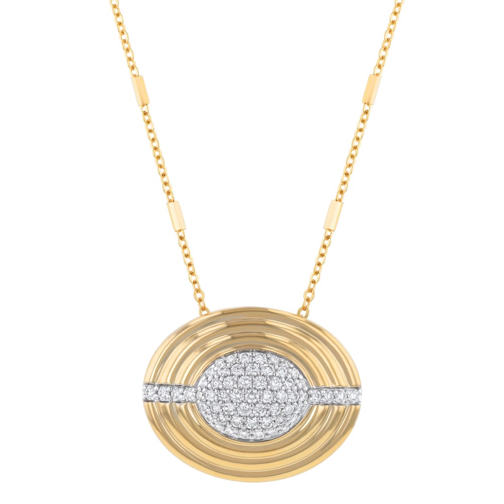 14K yellow gold oval pendant set with 0.70 carat round brilliant diamonds in textured finish. Chain sold separately.