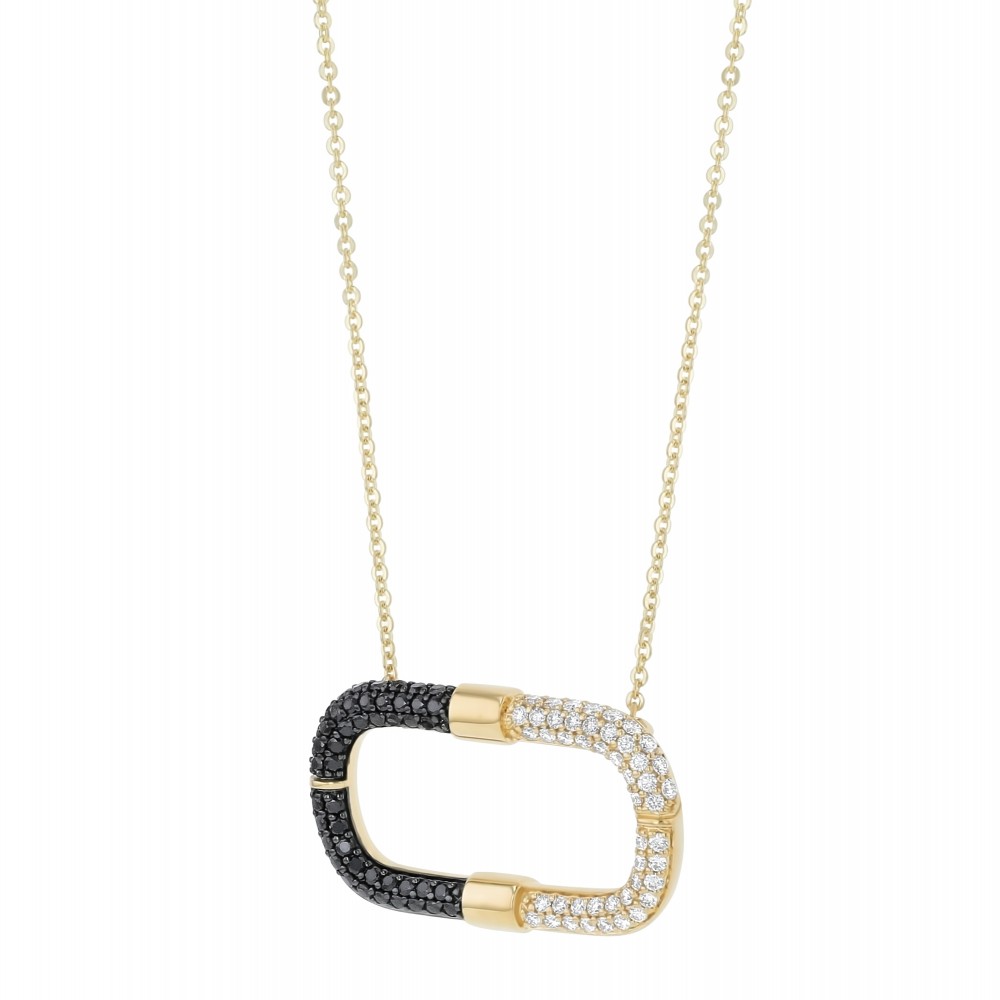 14K yellow gold necklace pave set with 0.75 carat round brilliant black and white diamonds in elongated tube design. Chain included.