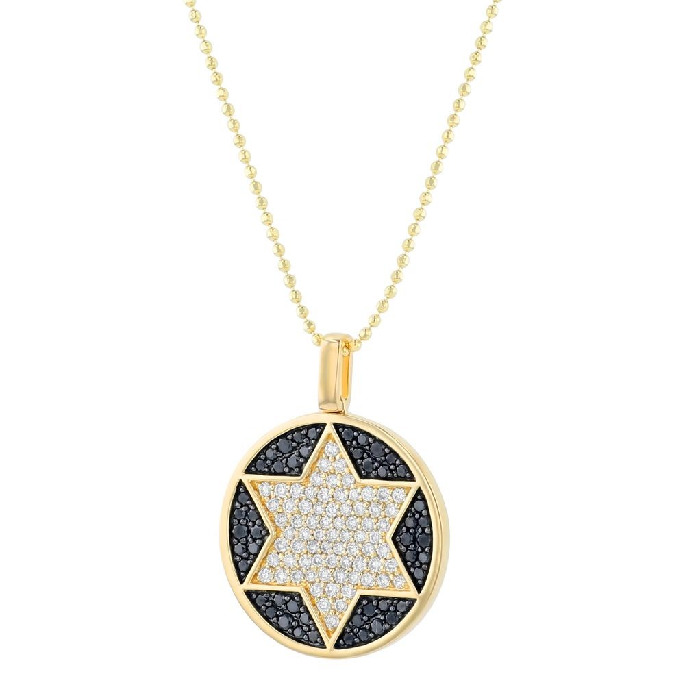 14K yellow gold round disk shape pendant set with 0.40 carat white diamonds and 0.35 carat black diamonds in Star of David design and detailed with black rhodium. Chain sold separately.