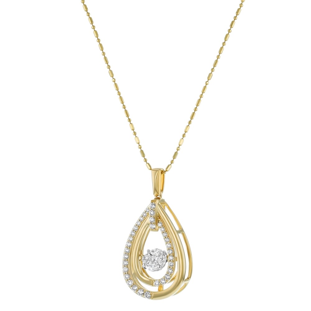 14K yellow gold pear shape necklace set with 0.75 carat Diamonds. The Dancing center features 0.32 carat marquise and princess fusion set diamonds and the halo is set with 0.43 carat round diamonds. Chain sold separately.