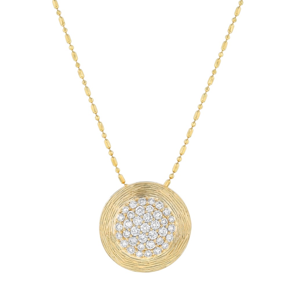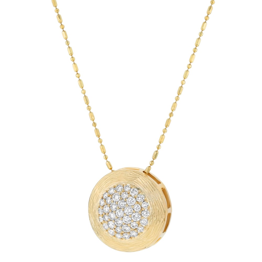 14K yellow gold round slider pendant pave set with 0.75 carat round brilliant diamonds in textured finish. Chain sold separately.