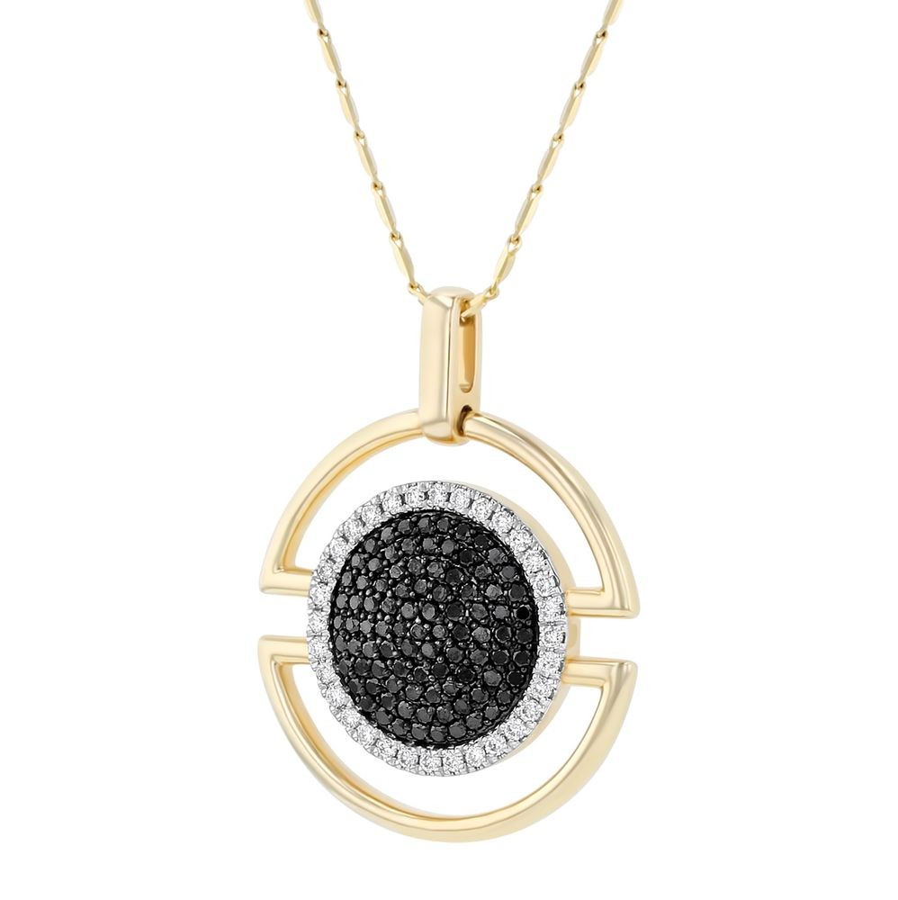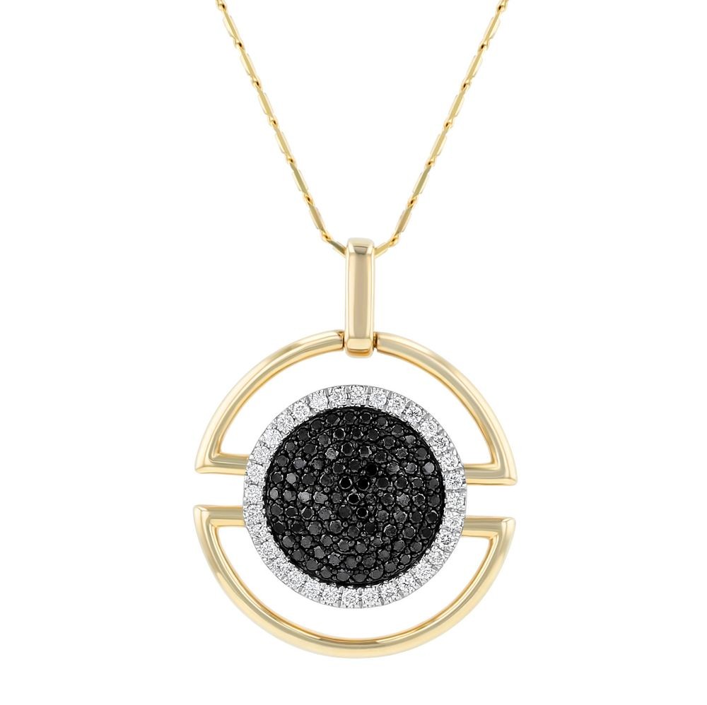 14K yellow gold geometric pendant set with 0.25 carat white and 0.55 carat black round brilliant diamonds in circle design. Chain sold separately.