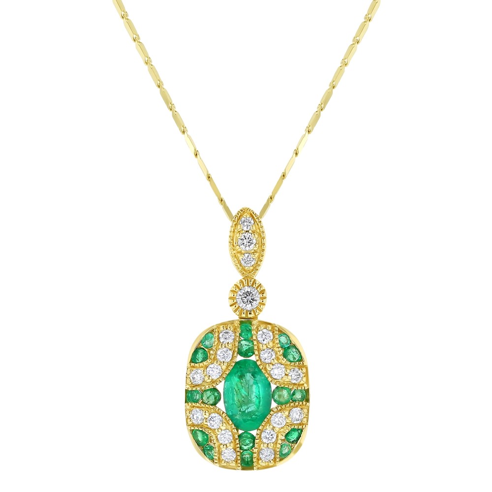 14K yellow gold art deco necklace set with 0.20 carat round brilliant diamonds and 0.65 carat oval and round green emeralds. Chain sold separately.