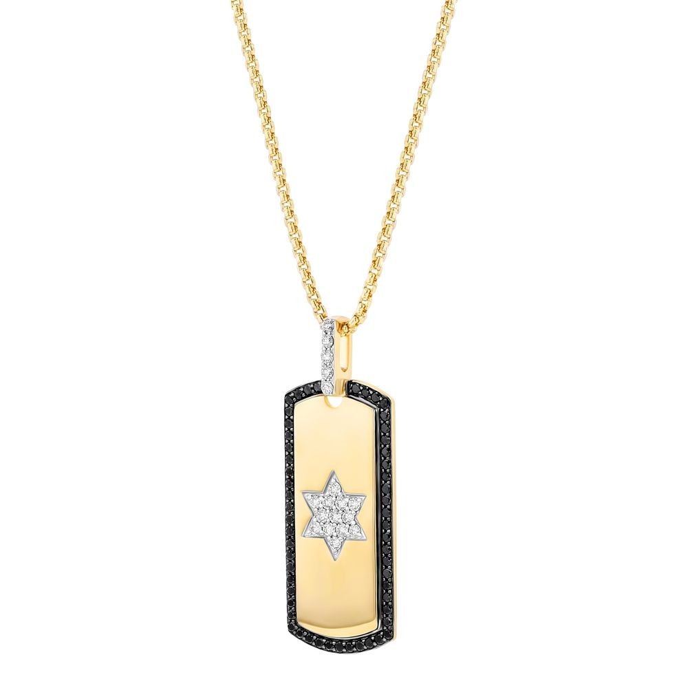 14K yellow gold dog tag shape pendant set with 0.40 carat white diamonds and 0.60 carat black diamonds in Star of David design and detailed with black rhodium. Chain sold separately.