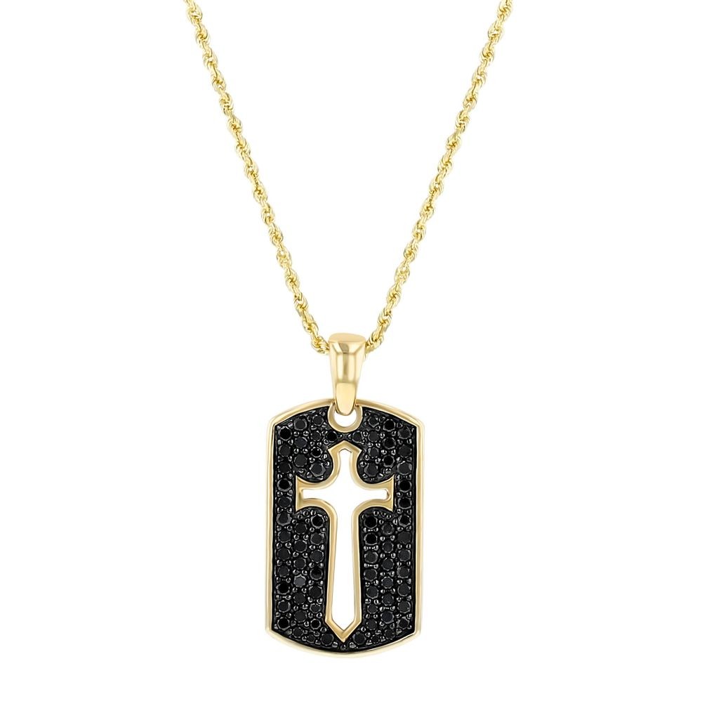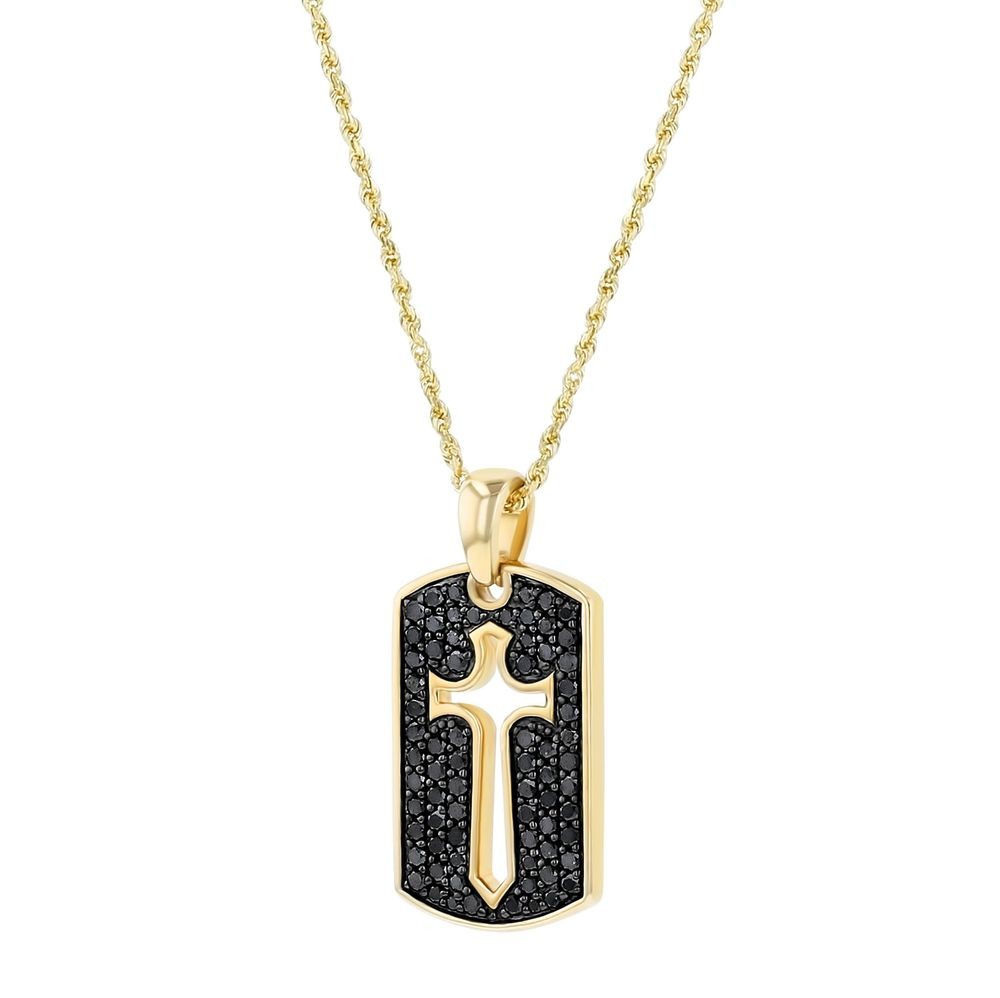 14K yellow gold dog tag pendant set with 1.0 carat round brilliant black diamonds in sword cross cut-out design and detailed with black rhodium. Chain sold separately.