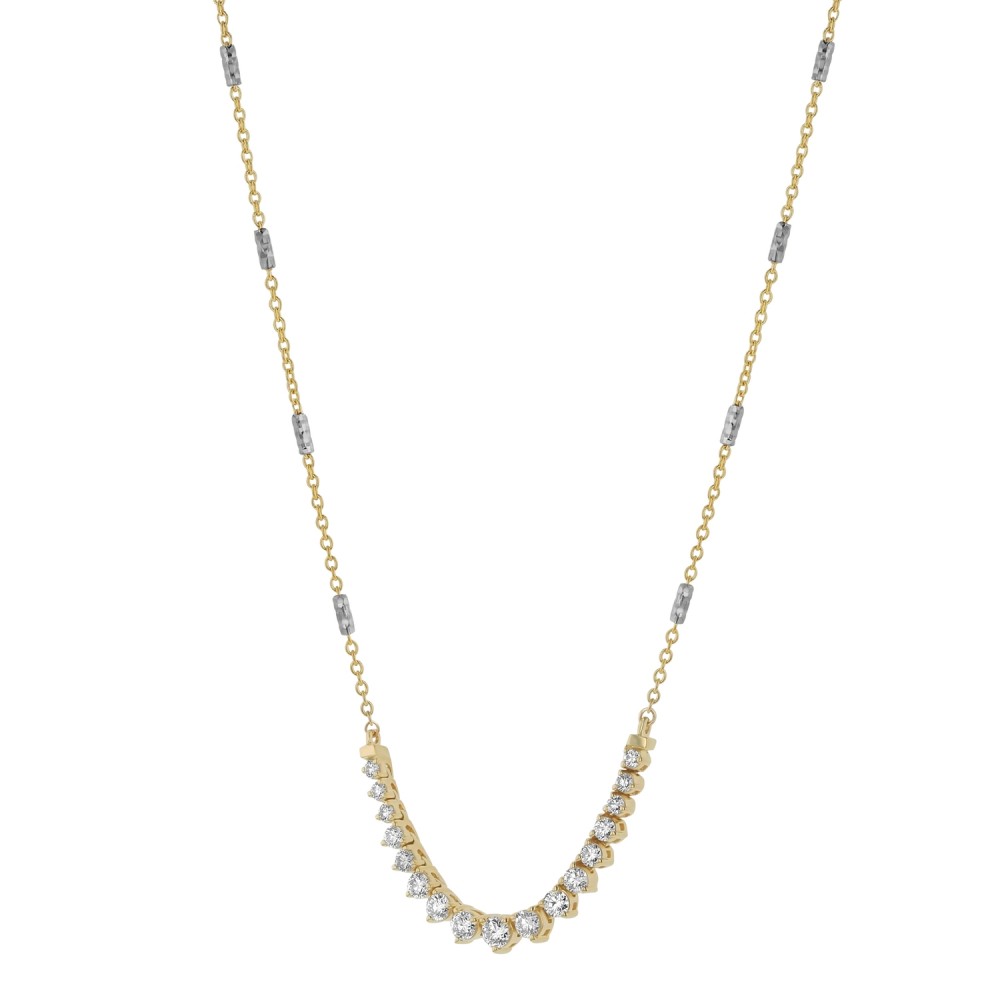 14K yellow gold 3 prongs flexible curved bar centerpiece necklace set with 1.00 carat round brilliant diamonds. Price includes chain.